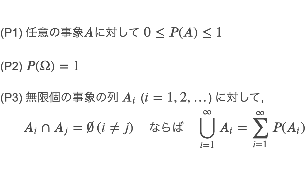 \(\displaystyle A_i \cap A_j =\emptyset \, (i\neq j)\) ならば \(\displaystyle\bigcup_{i=1}^{\infty} A_i =\sum_{i=1}^{\infty} P(A_i)\).